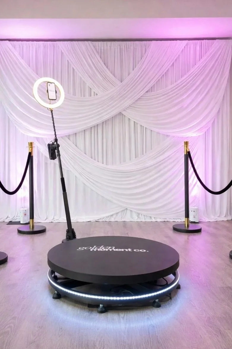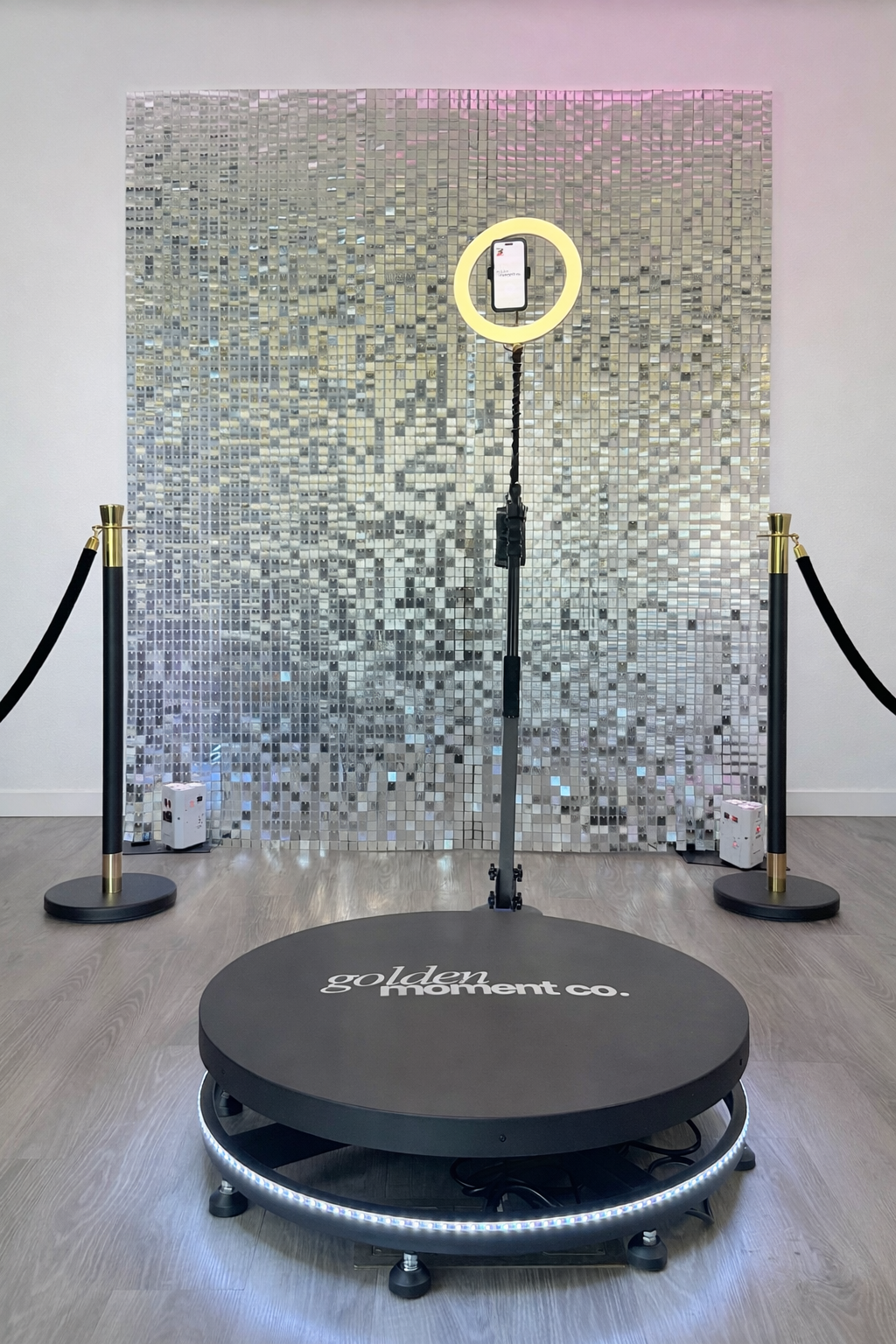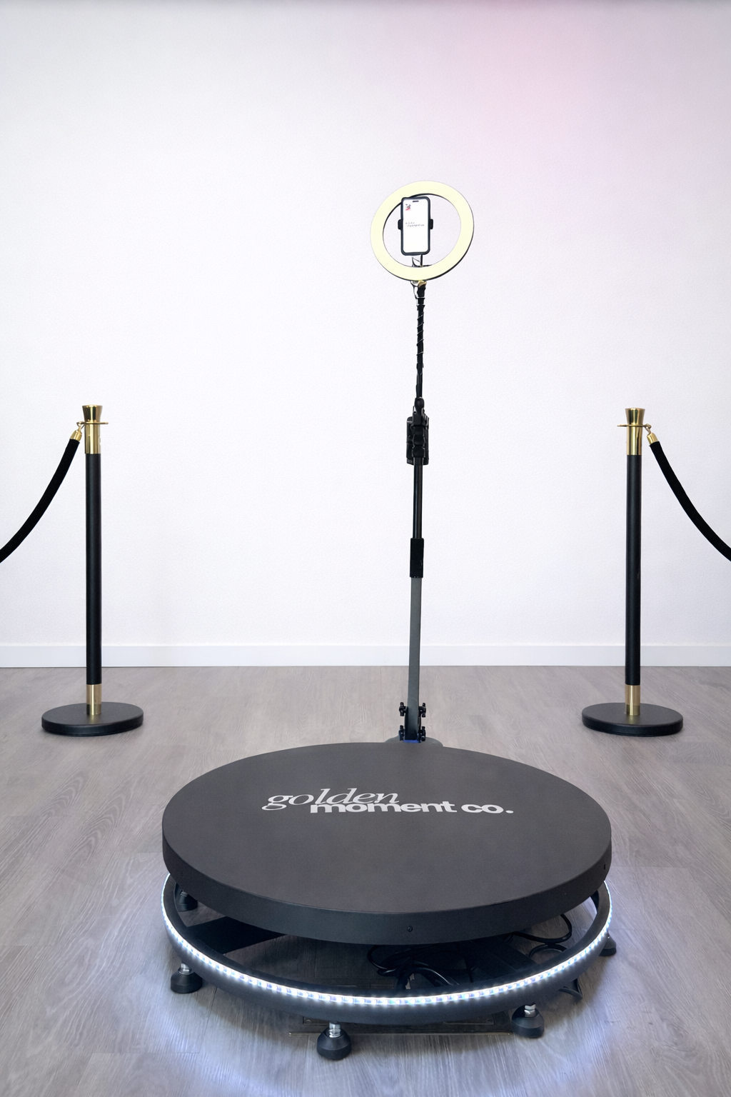 Step into the spotlight and capture your event from every angle with the Golden Moment 360 Photo Booth.